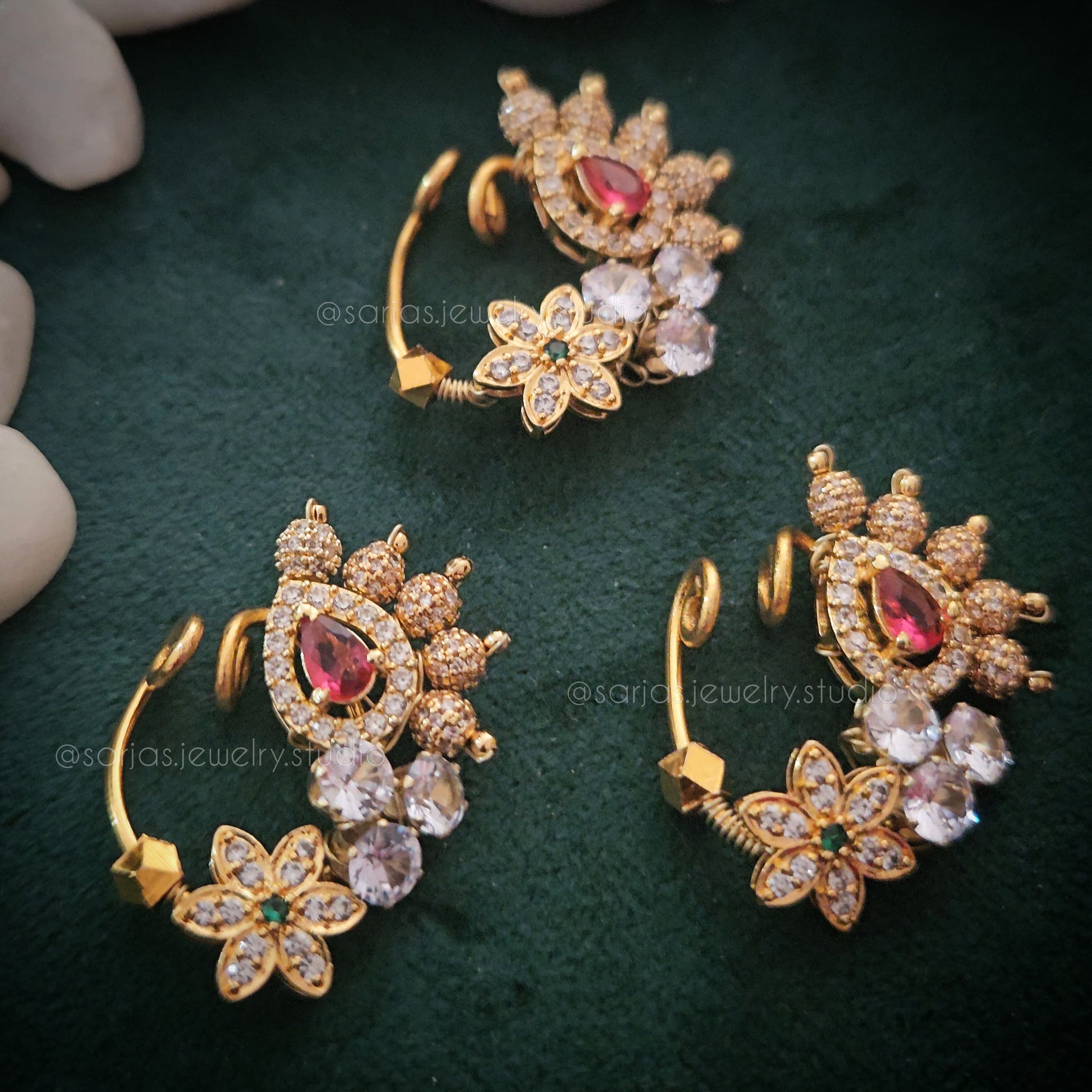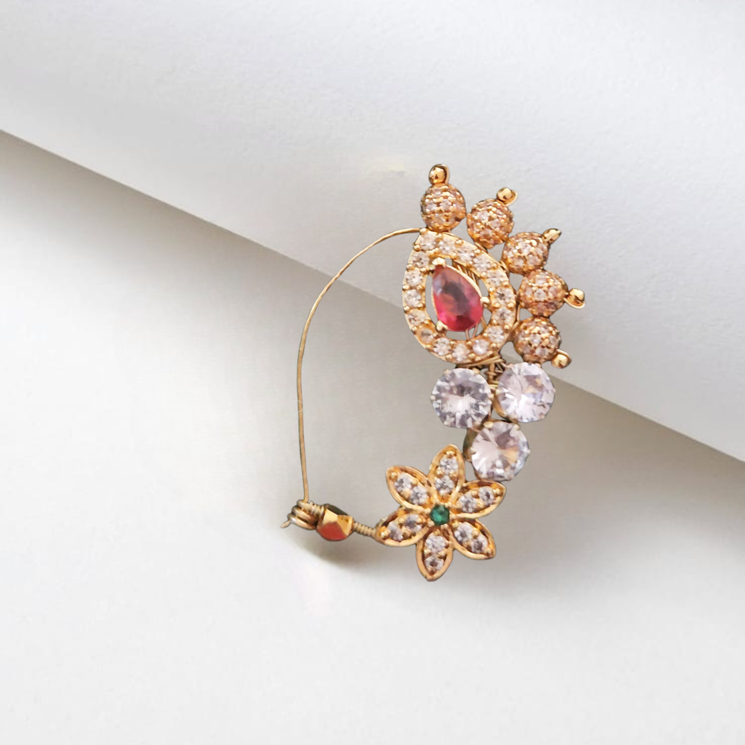 Elevate your traditional look with our signature handmade Devki nath, meticulously crafted using genuine Swarovski pearls. This authentic nose ornament made with premium brass matte beads and wires, ensuring durability while maintaining a sophisticated aesthetic. Each piece is individually handcrafted, making it a timeless addition to your ethnic jewelry collection.