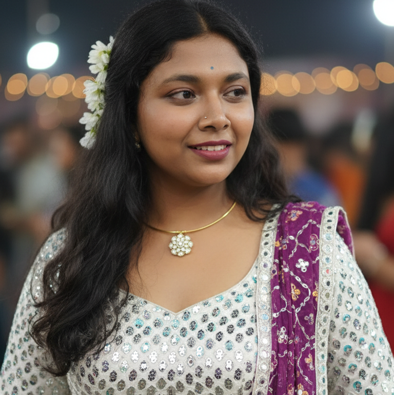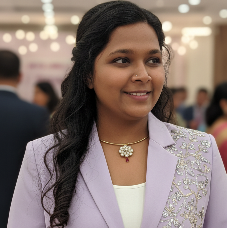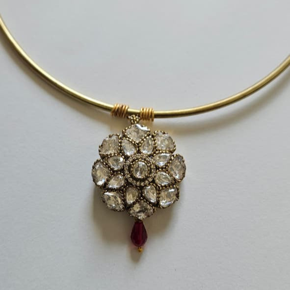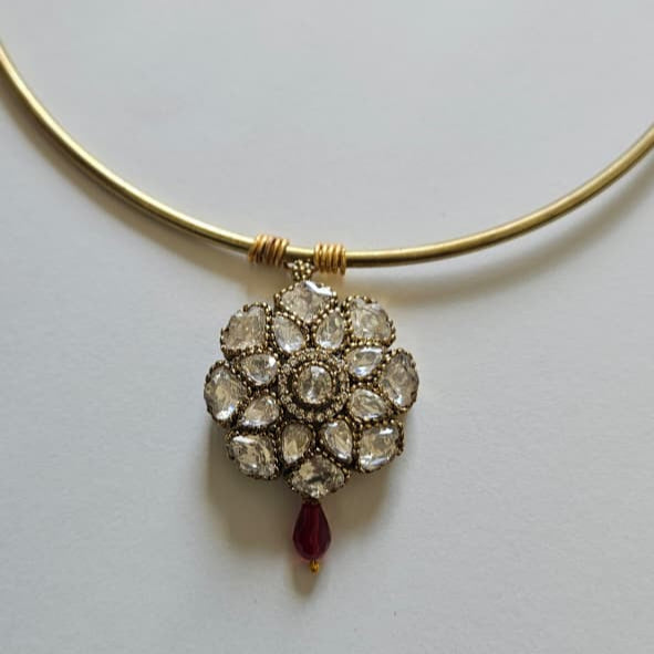 The Amruta Hasali necklace features a brass construction adorned with a Victorian-inspired polki pendant, offering a refined and minimal aesthetic. Its ball-hook arrangement at the back ensures a secure fit, making it an elegant choice for both office and traditional wear. This piece combines subtle sophistication with timeless design, perfect for those seeking understated elegance.