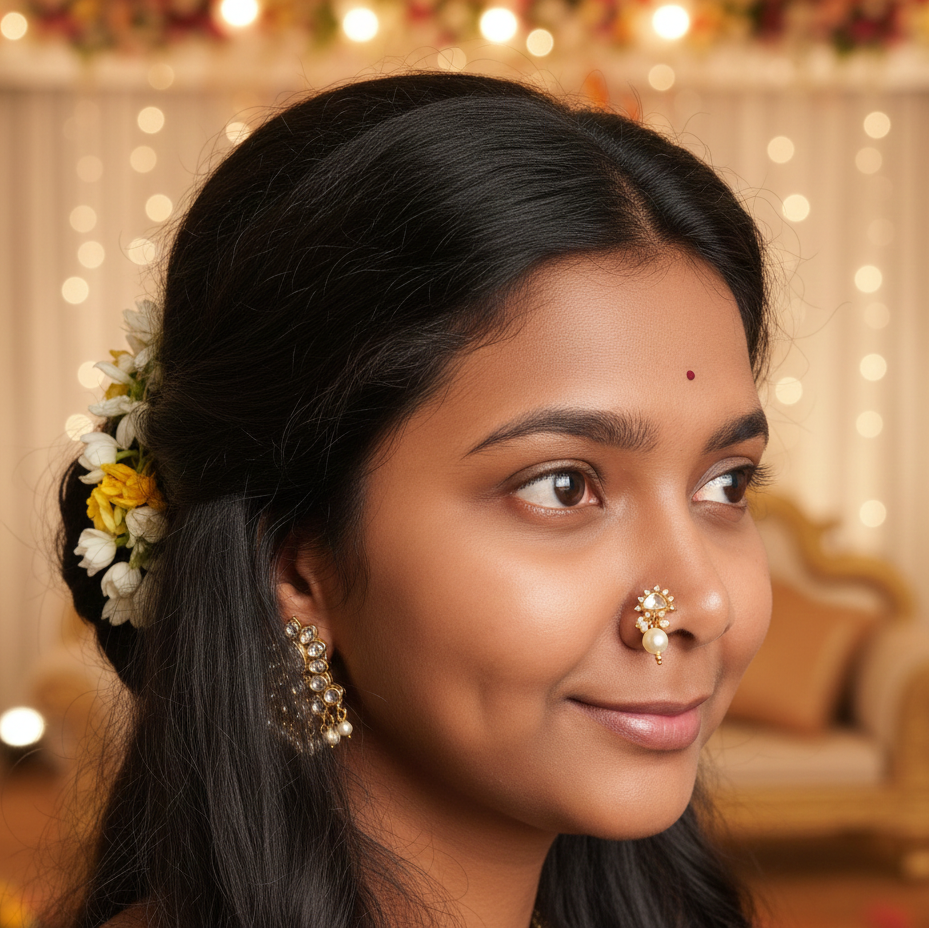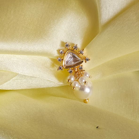 Experience timeless sophistication with this polki nosepin, where traditional craftsmanship meets contemporary design. The intricate polki motif is anchored by a lustrous silver backing, while delicate dangling pearls add graceful movement and dimension. The press-on style ensures comfortable, secure wear without piercing. Ideal for festive occasions or elevated everyday styling, this piece seamlessly blends heritage artistry with modern sensibility.