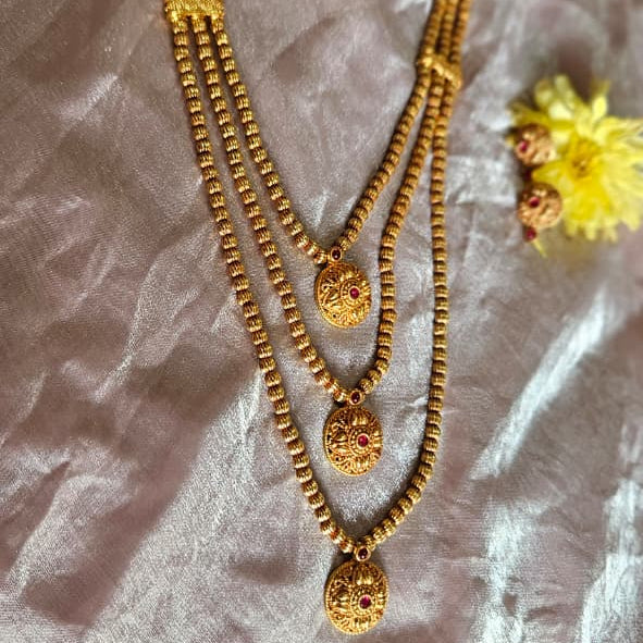 Elevate your ethnic ensemble with the Chintamani Haar, a sophisticated three-layered necklace crafted from polished gerua with an antique finish. Each layer flows gracefully, creating depth and movement that complements traditional attire. The adjustable back thread ensures a perfect fit for any occasion, while the matching earrings complete a cohesive, refined look. Understated yet striking, this piece embodies timeless elegance—ideal for weddings, festivals, and celebrations where classic beauty speaks volumes.