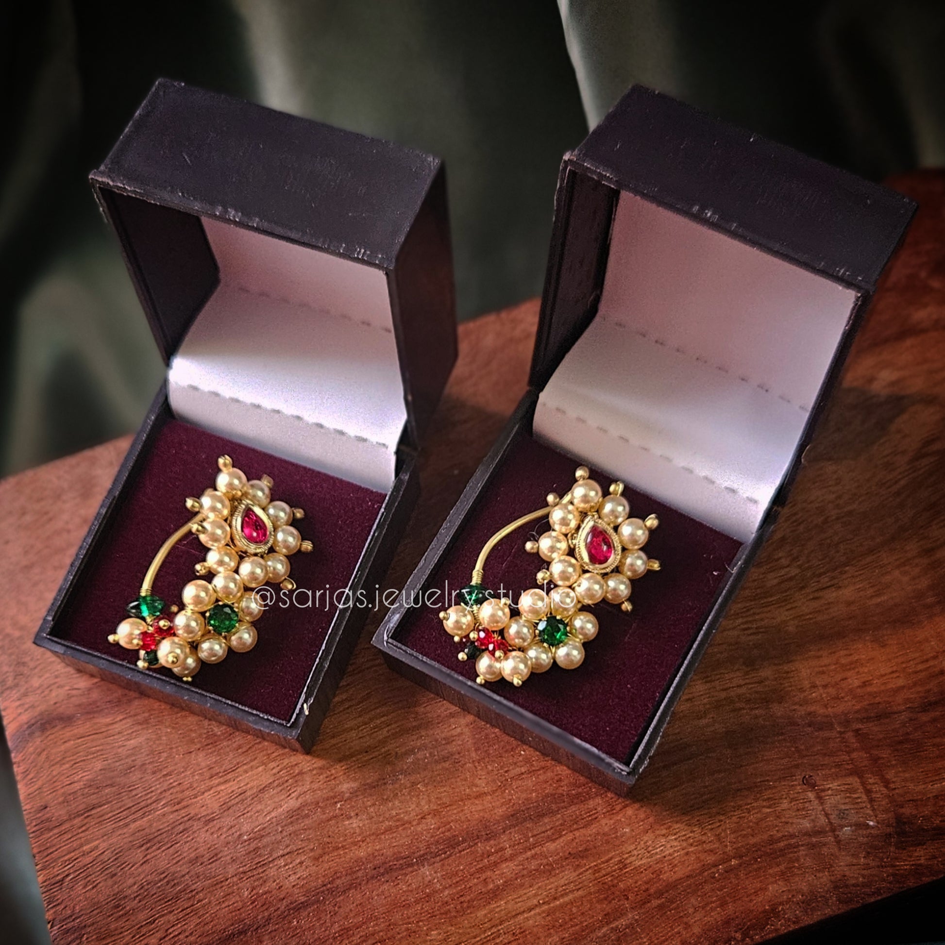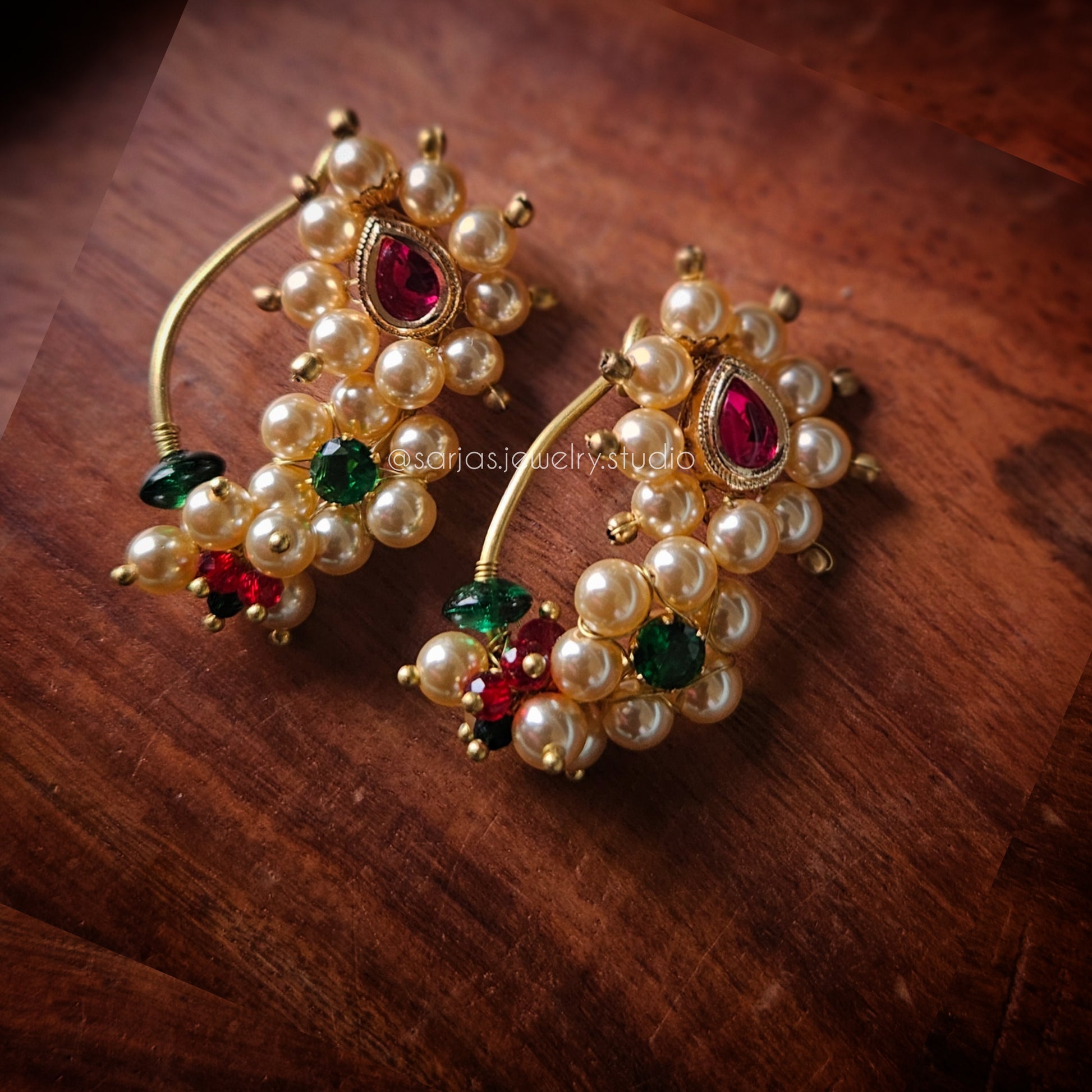 Elevate your traditional look with our signature handmade Devki nath, meticulously crafted using genuine Swarovski pearls. This authentic nose ornament made with premium brass matte beads and wires, ensuring durability while maintaining a sophisticated aesthetic. Each piece is individually handcrafted, making it a timeless addition to your ethnic jewelry collection.