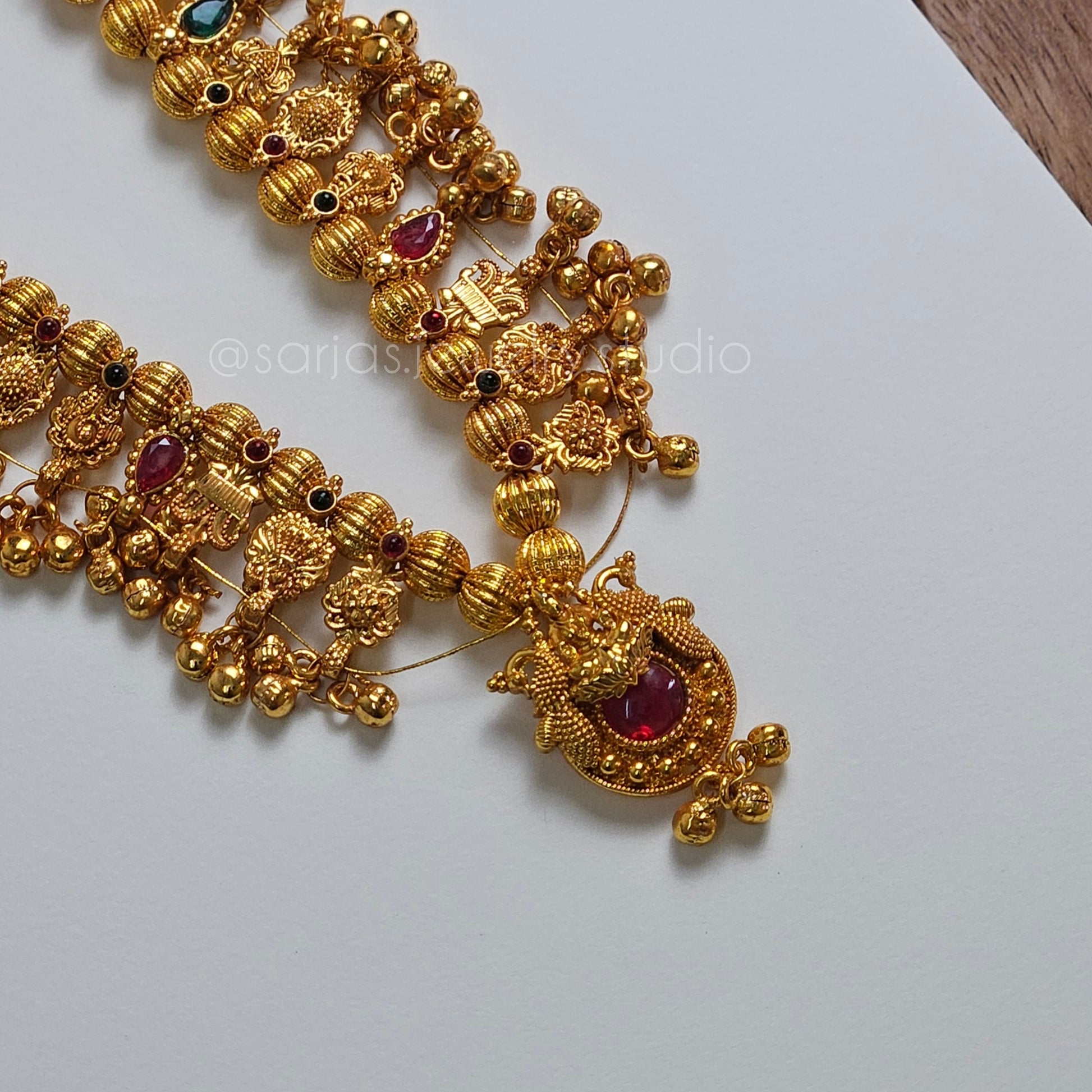 The Girija Kanthi Saaj features a delicate small collar design adorned with charming motifs and a central Goddess Laxmi pendant. Finished in traditional geru, this piece combines spiritual significance with subtle elegance, making it a refined choice for those who appreciate classic Maharashtrian jewelry craftsmanship.