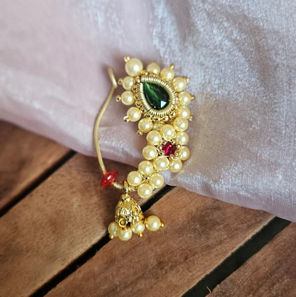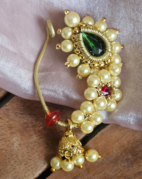 The Gopikabai Nath exemplifies traditional craftsmanship with its bold, statement-making design. Handcrafted with meticulous precision, this nose ornament showcases yellowish premium faux pearls adorned with an elegant jhumka for authentic charm. Versatile in wear, it's available in both press-on and piercing variants, allowing you to choose the style that suits your preference. This nath delivers the same exquisite quality and traditional aesthetic. Ideal for weddings, festivals, and celebrations, it combines heritage elegance with modern convenience.