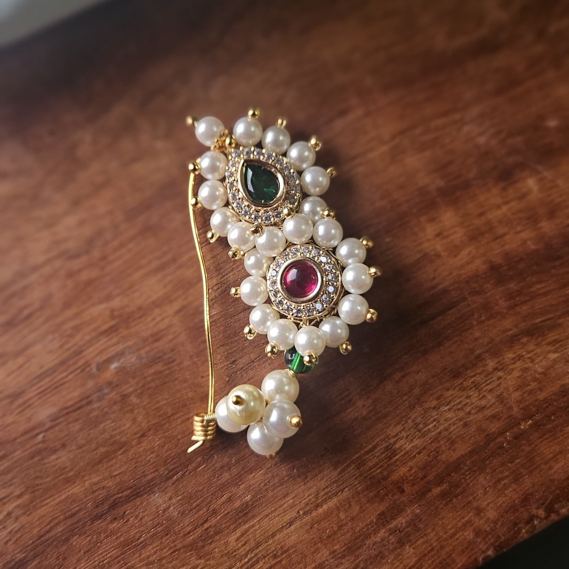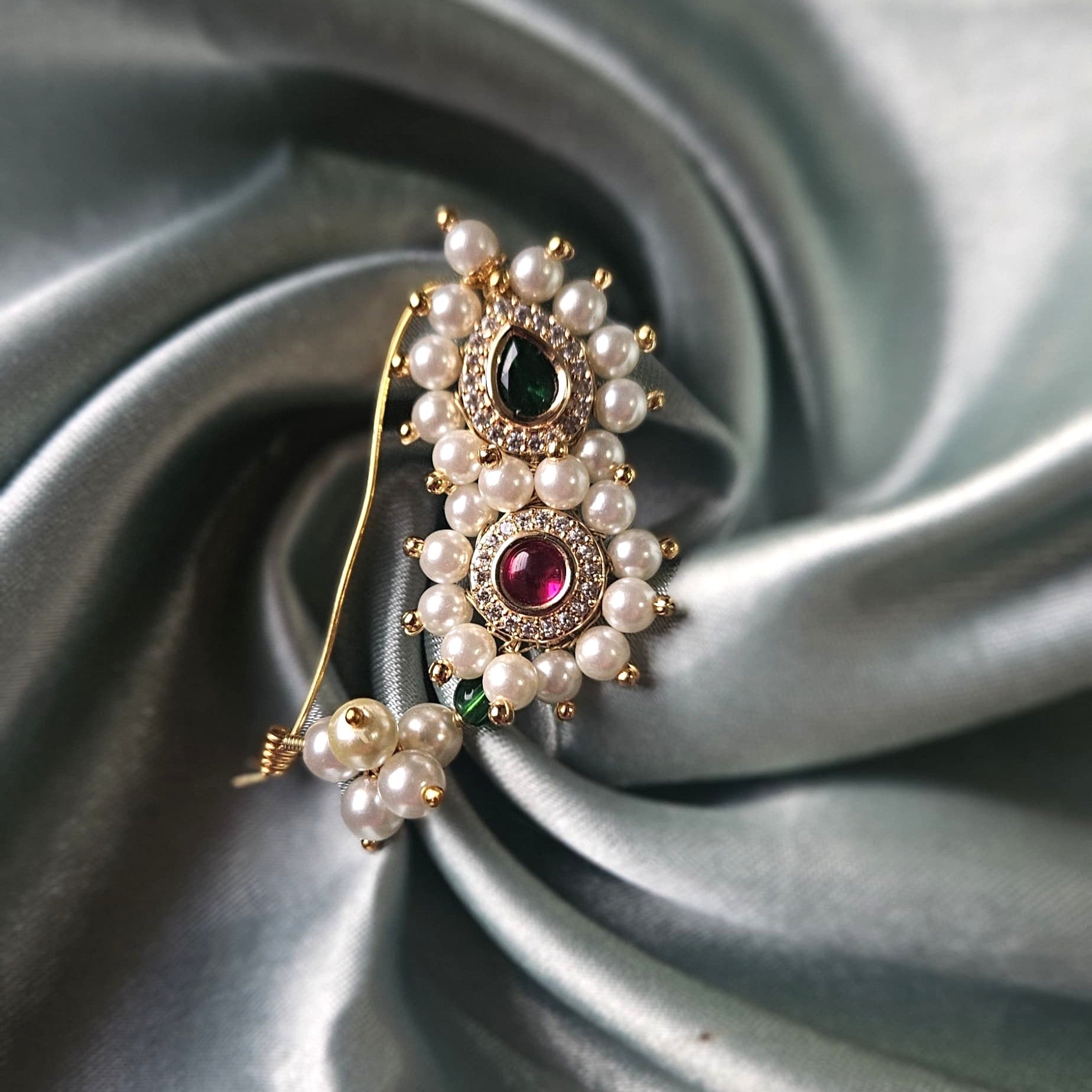 The Hindavi nath, crafted with premium Japanese pearls, exemplifies the traditional Peshwai style with its exquisite ruby pink and emerald green motif. The word 'Hindavi' holds a special place in Marathi tradition, symbolizing both historical significance and contemporary cultural pride, making it a distinguished accessory for those who appreciate heritage and elegance.
