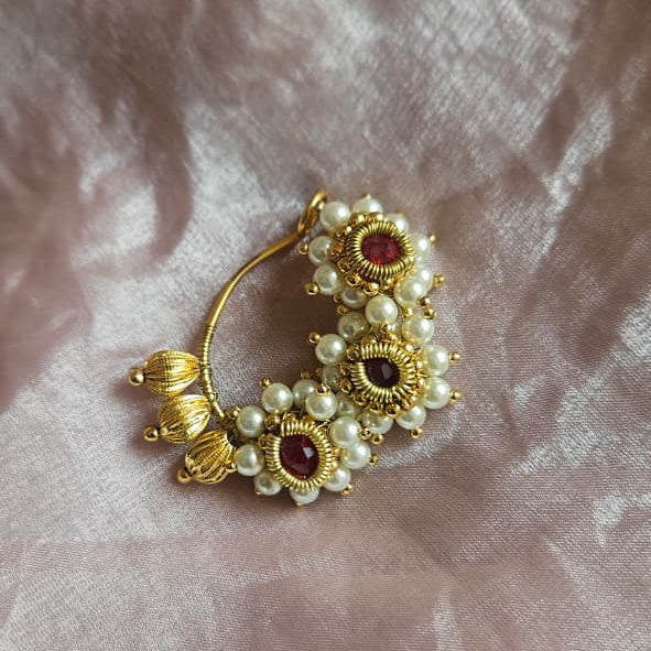 The Latika Nath showcases a delicate pearl flower accented with a striking red crystal at its center, offering a bold statement look favored by brides. This exquisite design blends elegance with vibrant detail, making it a standout piece for bridal wear. Its unique combination of pearls and crystal ensures it remains a bestseller for those seeking timeless yet eye-catching jewelry.