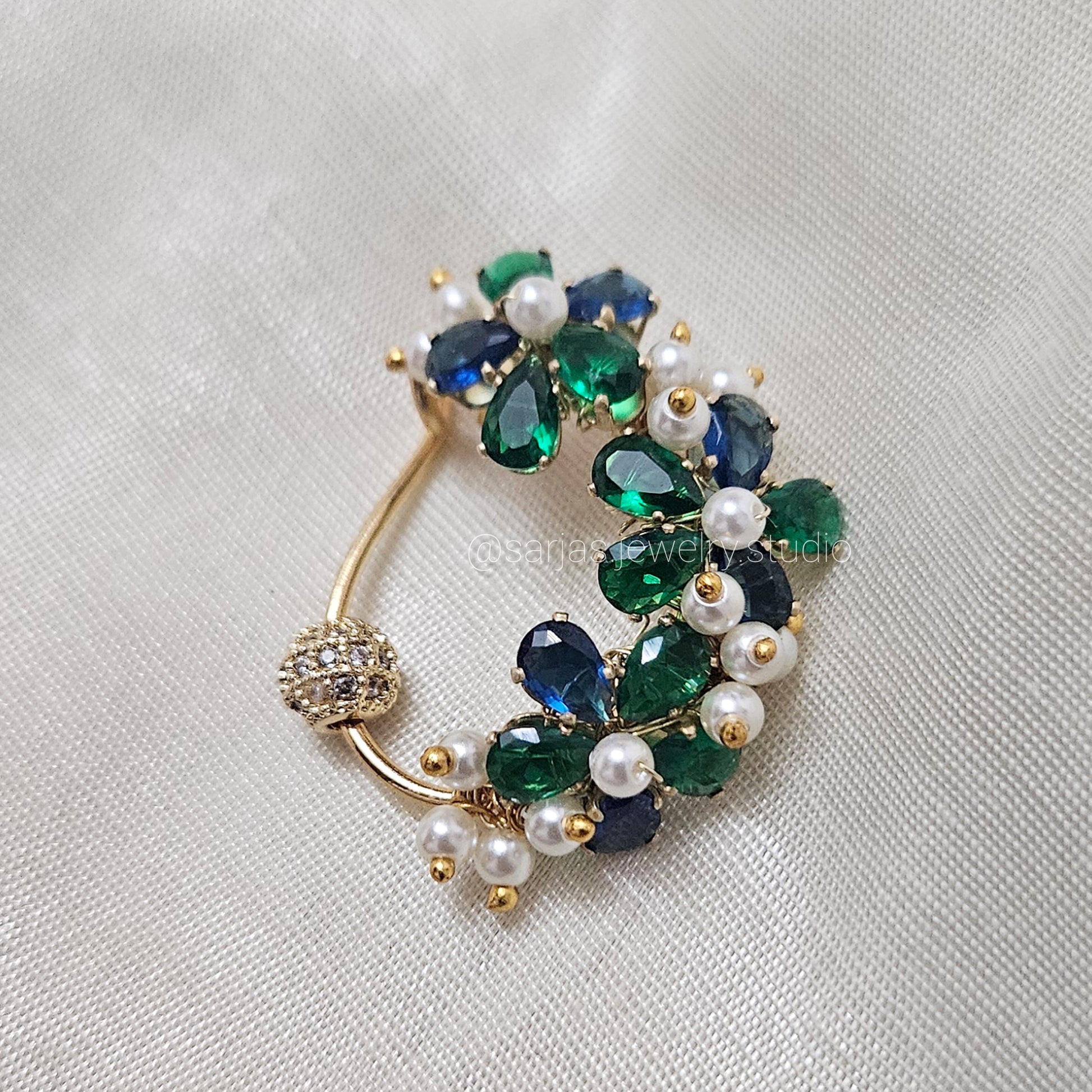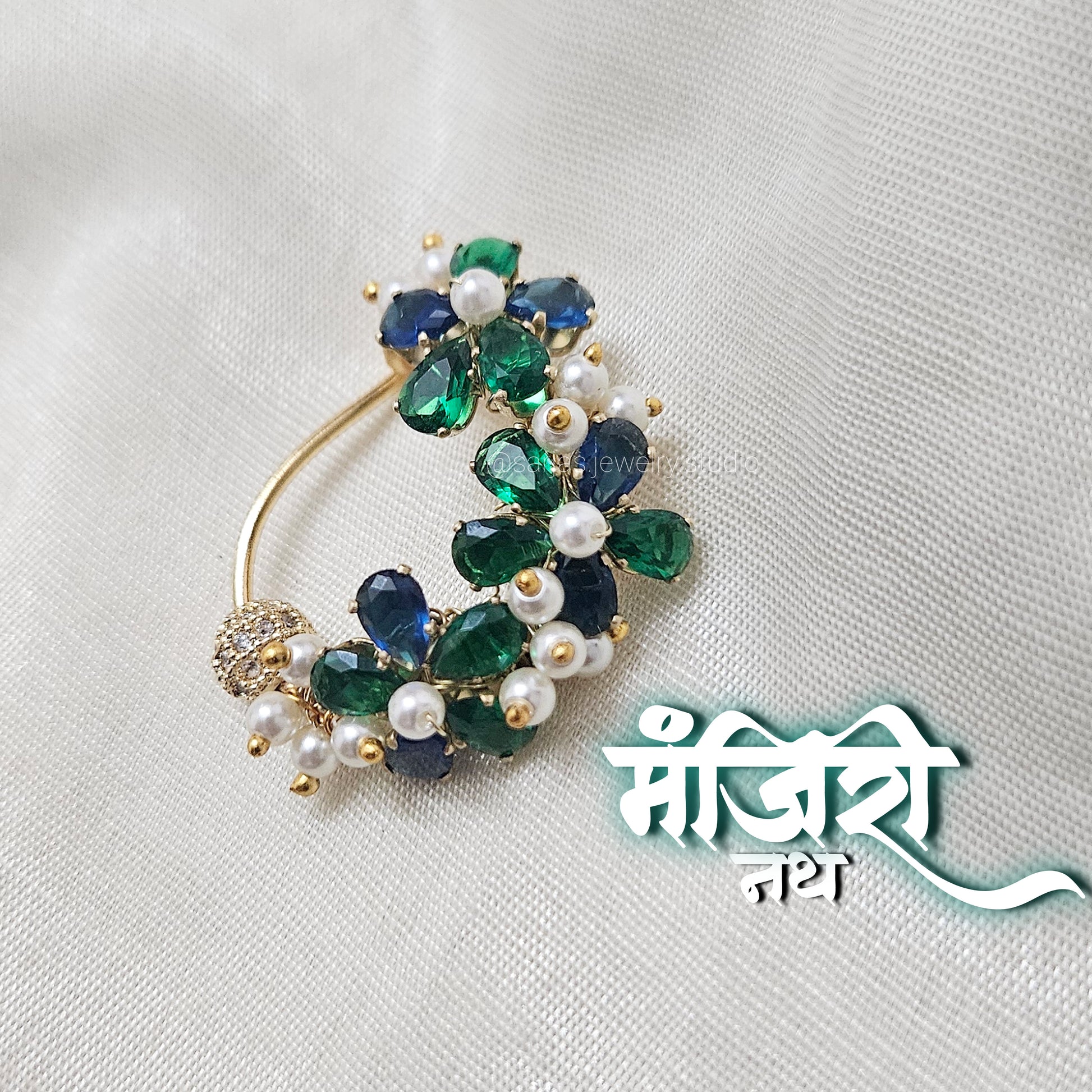 The Manjiri Nath presents a sophisticated contemporary aesthetics. This small floral nose ornament features a modern design rendered in luxurious peacock-inspired colors—rich teals, emeralds, and royal blues. Versatile by design, it can be worn as either a press-on accessory or traditional piercing, allowing for customized styling options while maintaining authentic cultural elegance.