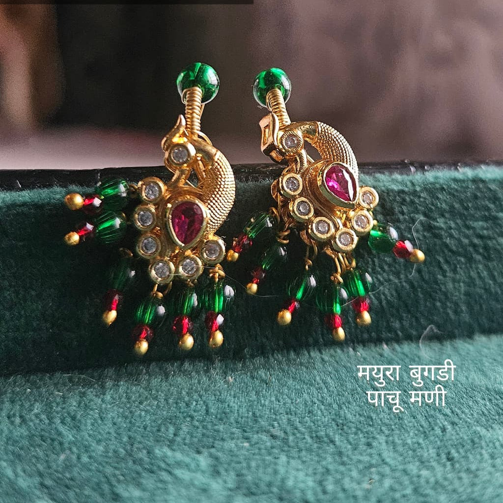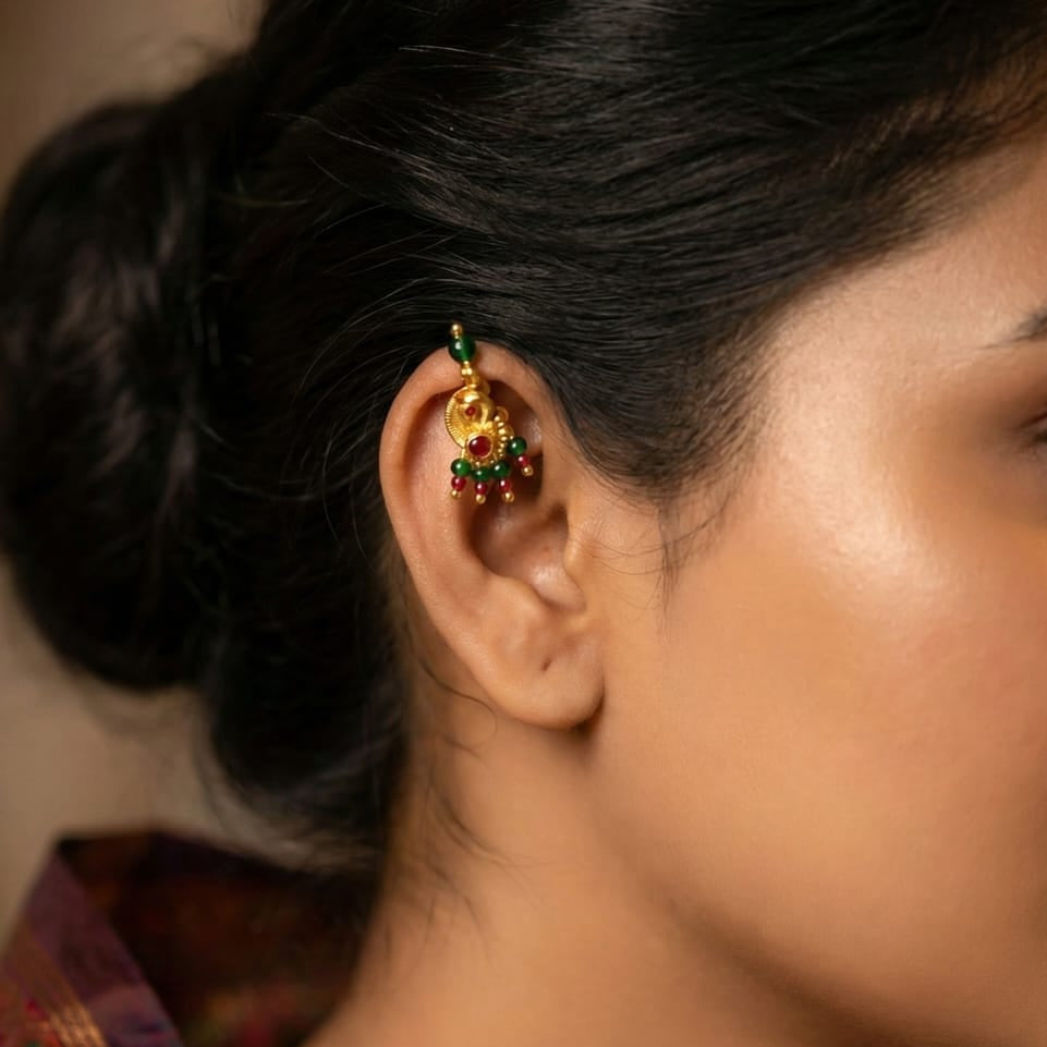 Elevate your ear styling with this exquisite Mayura Bugadi, a traditional peacock-inspired ear ornament designed for the upper ear. Crafted with meticulous attention to detail, this press-on piece features graceful dangling green glass beads that catch light with every movement. The secure press-on mechanism ensures comfortable, all-day wear without piercing, making it an ideal choice for those seeking versatile, non-permanent jewelry. Perfect for festive occasions or everyday elegance, this bugadi combines timeless artistry with modern convenience.