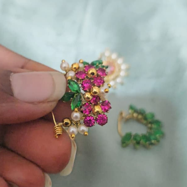 The Meera Nath is an exquisitely handcrafted, delicate nose ring designed in both press-on and piercing styles. Made with Purpleand Green AD (American Diamonds), it offers a subtle yet elegant sparkle suitable for ethnic wear and special occasions. Its small size ensures a minimal and delicate look while enhancing your natural beauty with refined craftsmanship and expert artistry.