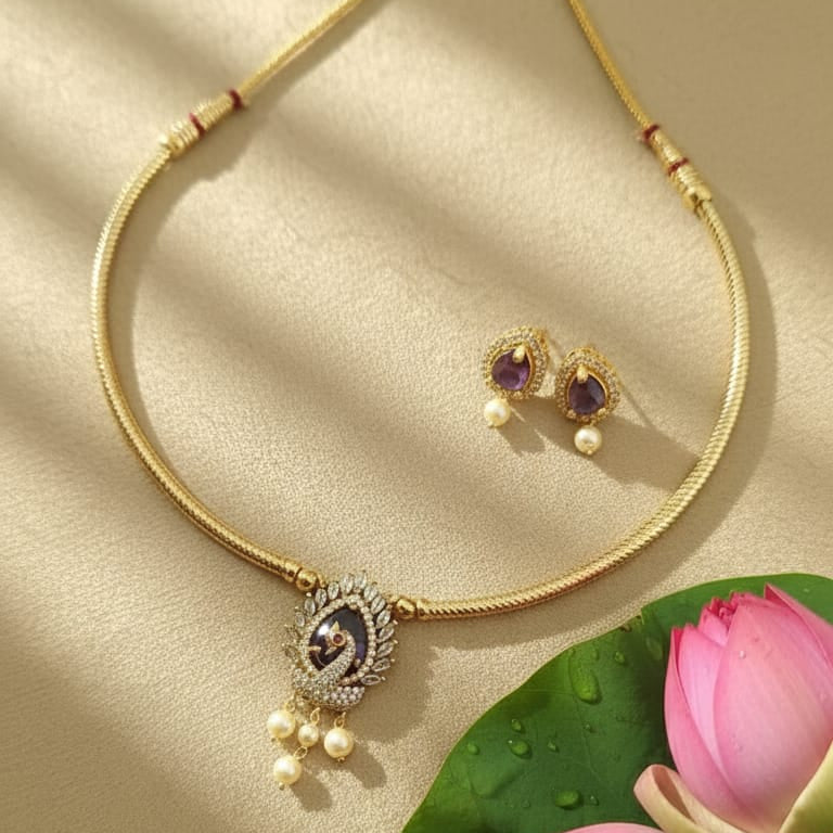 Embrace timeless elegance with this Victorian Polish Sari in regal purple, adorned with an exquisite peacock pendant that captures intricate craftsmanship. This curated set includes matching earrings and offers flexible styling options—choose with or without the traditional bugadi to suit your preference. Perfect for celebrations, weddings, or special occasions, this piece seamlessly blends Victorian artistry with classic sari sophistication, delivering a statement look that honors both heritage and contemporary grace.