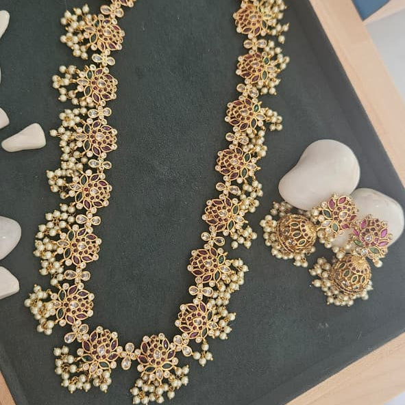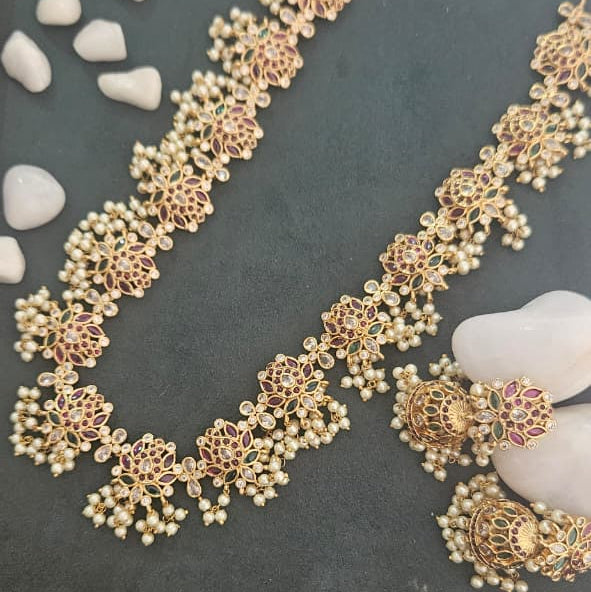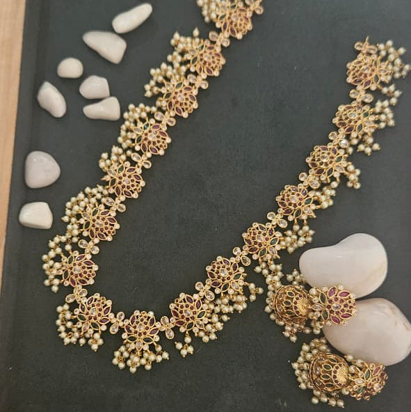 The Nishigandha haar showcases an intricate lotus motif paired with luminous dangling pearls that sway gracefully with movement. This curated long necklace set includes a matching statement jhumka, offering a complete coordinated look for discerning jewelry enthusiasts. The lotus design carries profound symbolic meaning while the pearl embellishments provide timeless elegance, making this collection perfect for weddings, festivals, and formal occasions where refined sophistication is paramount.