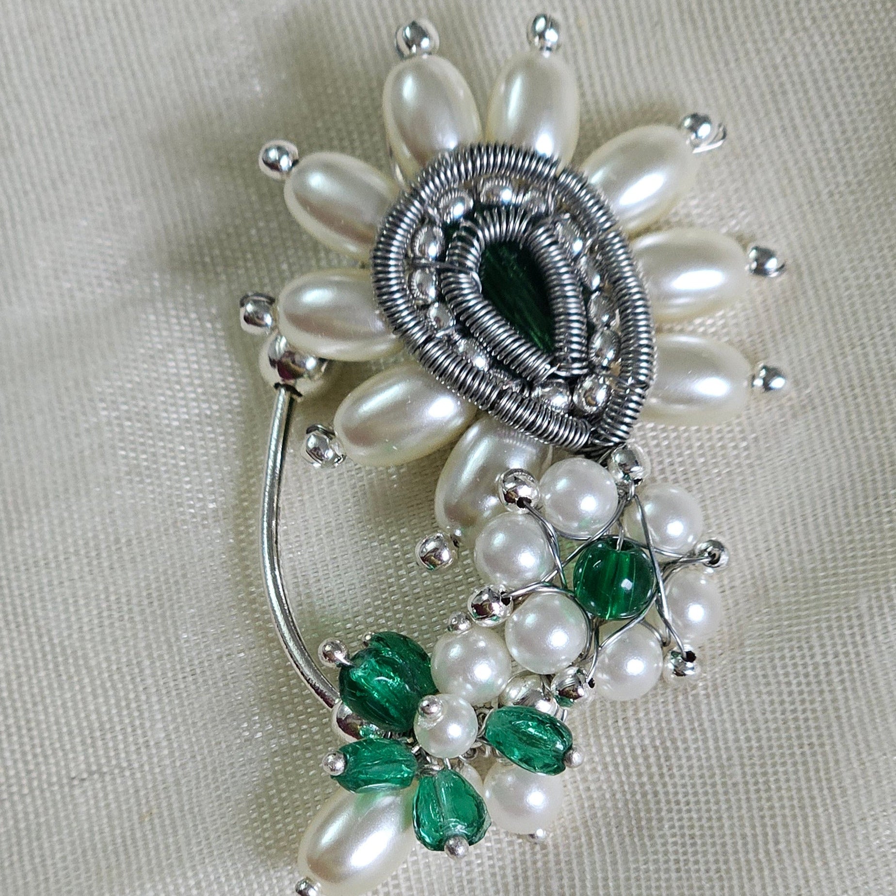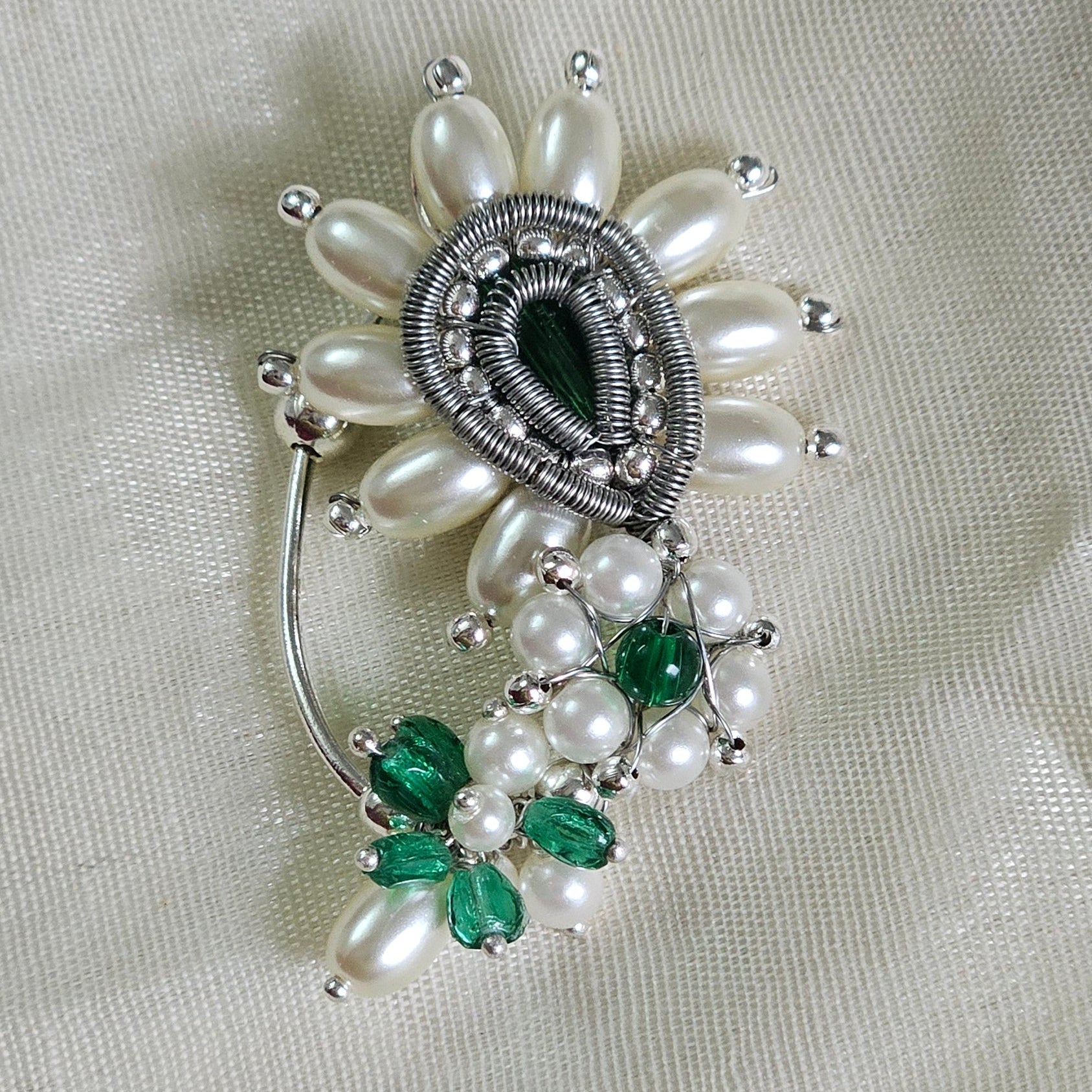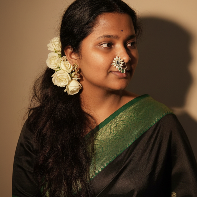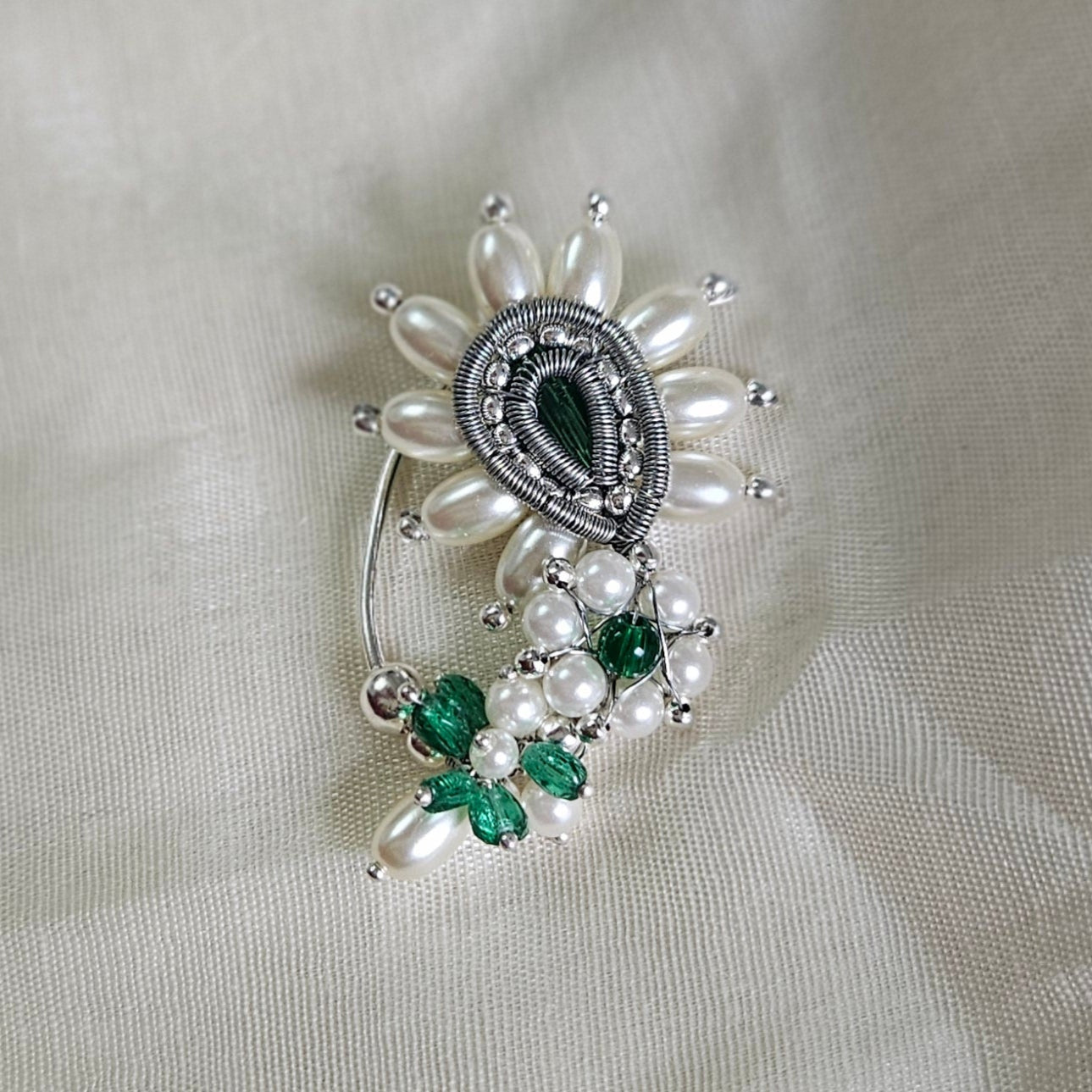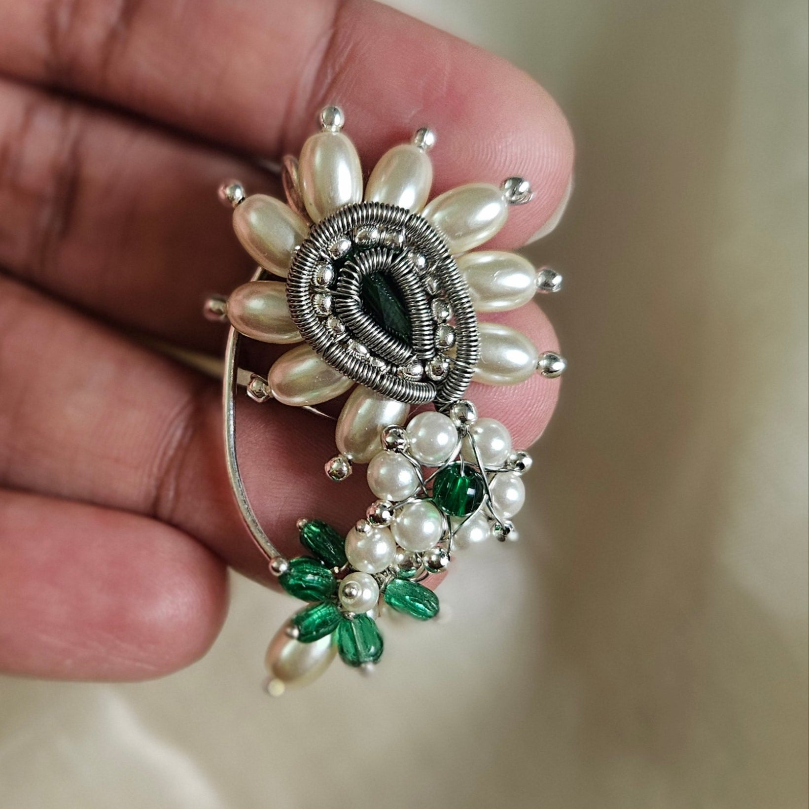 Elevate your traditional look with the Rajata Nath, featuring handcrafted silver finishing and adorned with oval Japanese premium quality pearls. This exquisite piece combines green beads and micro-plated silver beads, offering a unique balance of elegance and craftsmanship. Available in both press-on and piercing styles, it ensures versatile wear without compromising comfort or style. Perfect for those who appreciate refined artistry and premium materials in their jewelry collection.