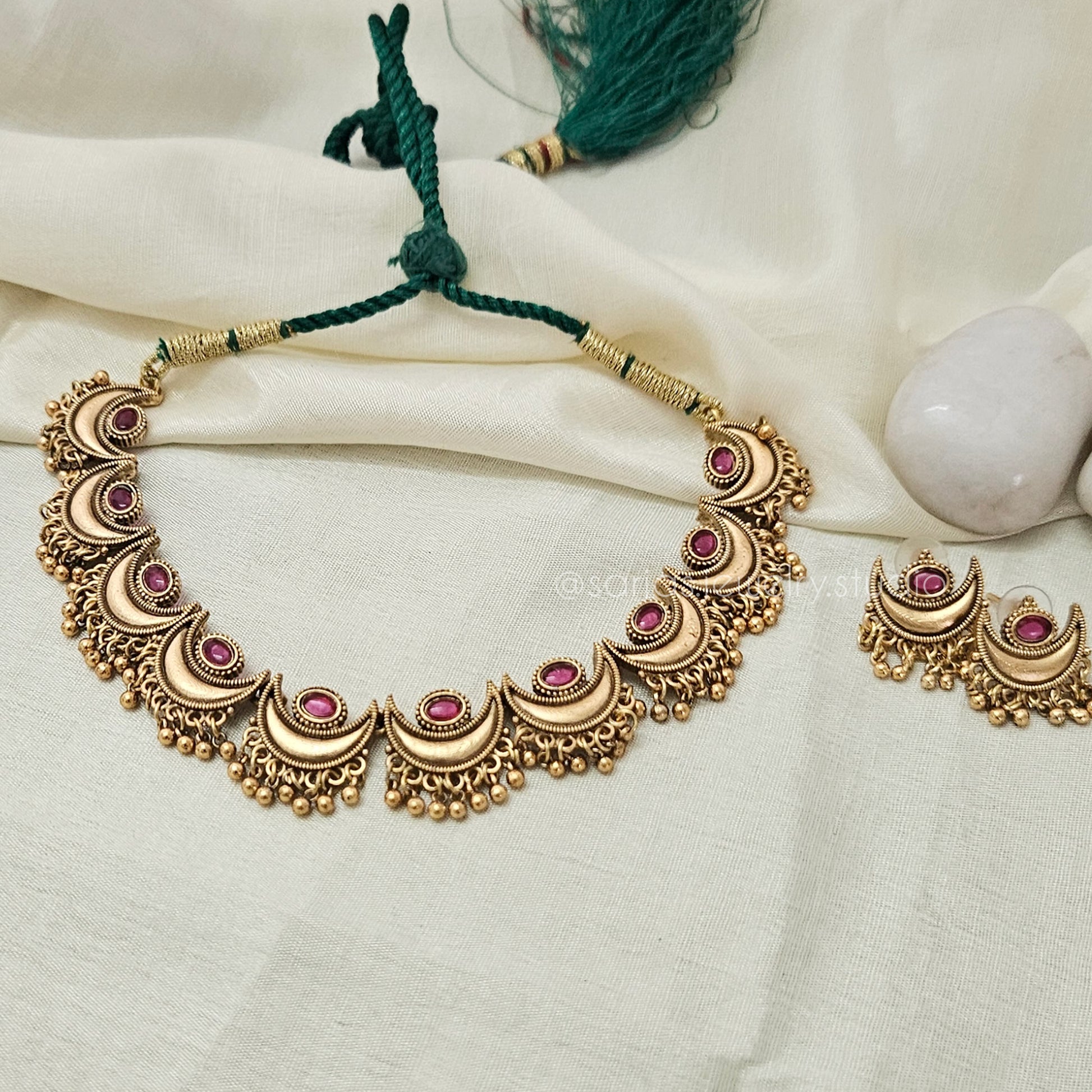 The Revati Chandrahar set features a popular moon necklace with a delicate smaller crescent moon motif and matching earrings. Its adjustable thread at the back allows for a perfect fit and makes it ideal for layering with other necklaces. This elegant design offers versatility and celestial charm, enhancing your style with subtle sophistication.