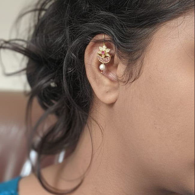 Rohini Bugadi showcases an enchanting flower and crescent moon motif rendered in rich ruby pink, creating a celestial-inspired aesthetic. This press-on style bugadi features an attractive pearl hanging that adds refined elegance to your ensemble. The intricate design combines traditional craftsmanship with contemporary wearability, making it an ideal choice for those seeking distinctive jewelry that seamlessly transitions from everyday wear to special occasions. The pearl accent enhances the overall sophistication of this piece.