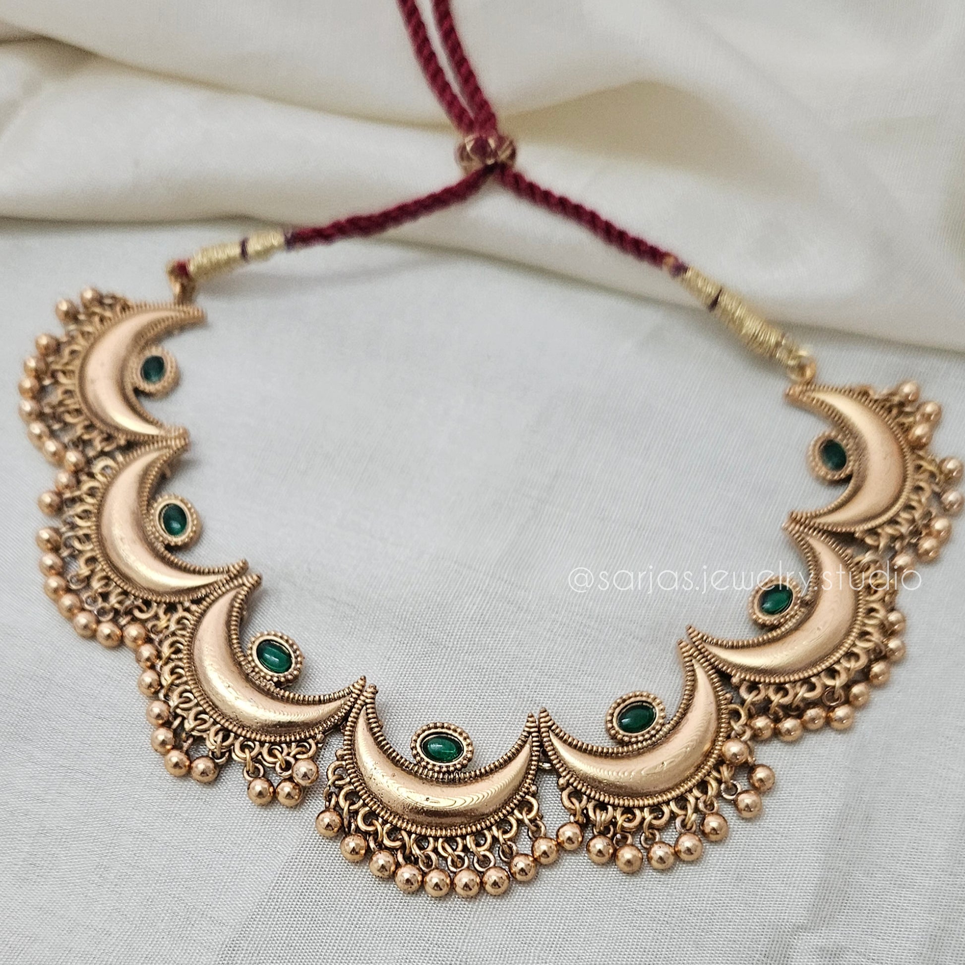 The Rohini Chandrahar set features a popular moon necklace with a series of bold and big crescent moon motif and matching earrings. Its adjustable thread at the back allows for a perfect fit and makes it ideal for layering with other necklaces. This elegant design offers versatility and celestial charm, enhancing your style with subtle sophistication.