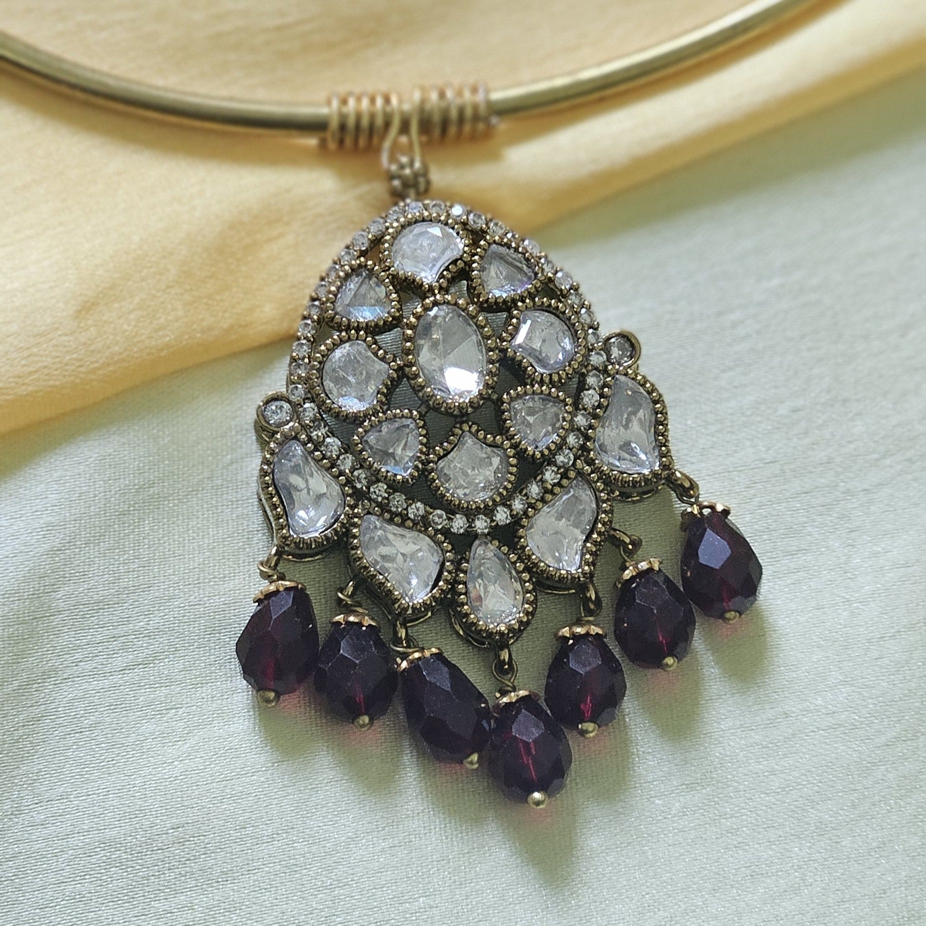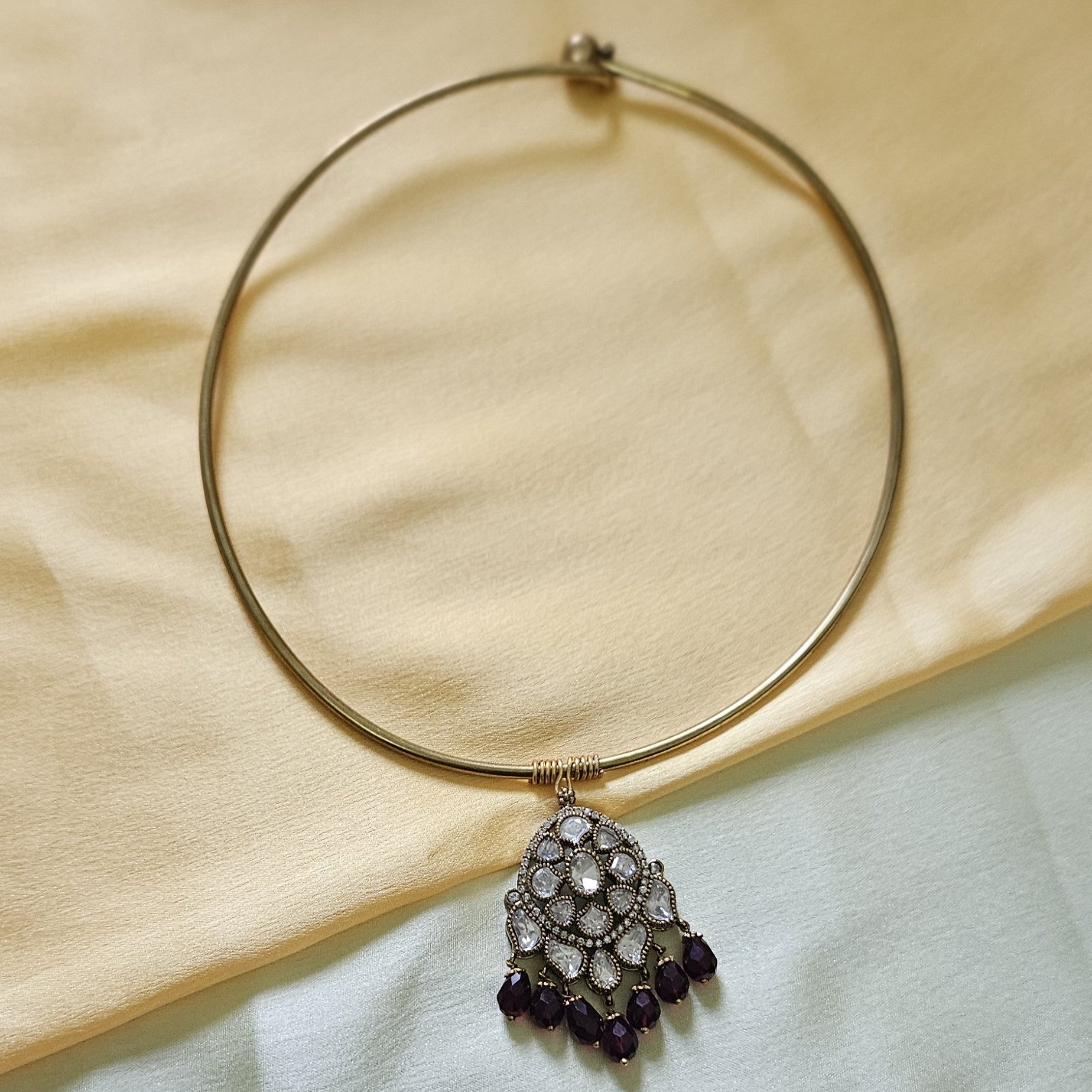The Shrija Hasali necklace features a brass construction adorned with a Victorian-inspired polki pendant, offering a refined and minimal aesthetic. Its ball-hook arrangement at the back ensures a secure fit, making it an elegant choice for both office and traditional wear. This piece combines subtle sophistication with timeless design, perfect for those seeking understated elegance.