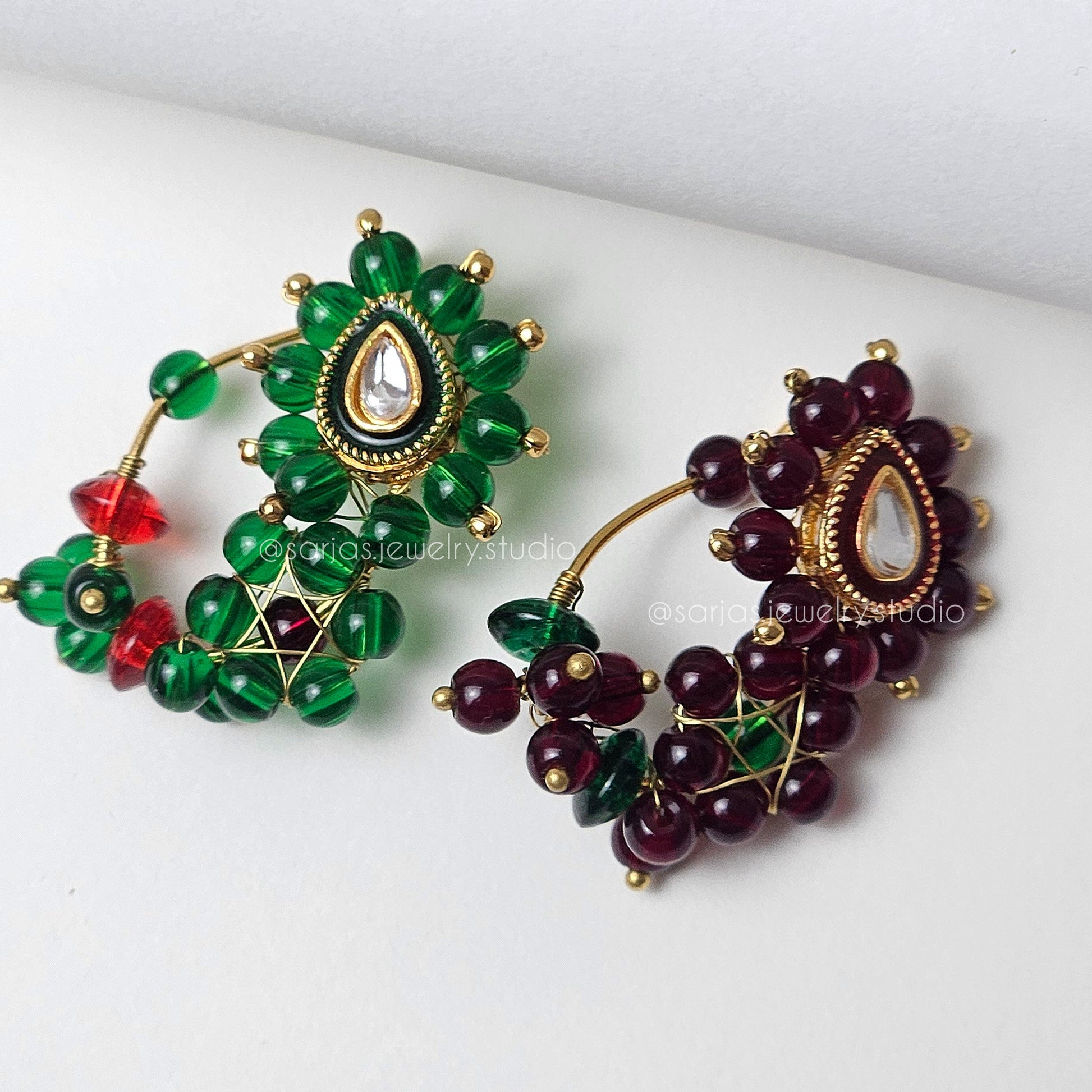 Meticulously handcrafted using premium green glass beads, the Sugandha Nath offers both elegance and versatility. Designed to be worn comfortably, it is available in both press-on and piercing styles, allowing you to choose the perfect fit for your preference. This exquisite piece blends traditional craftsmanship with modern convenience, enhancing your ensemble with a vibrant touch of color and sophistication.