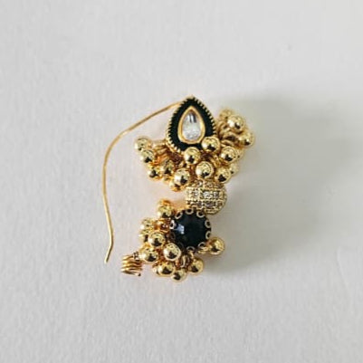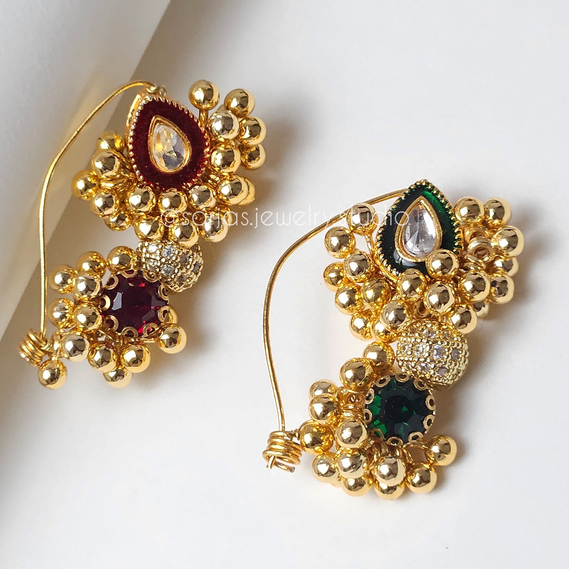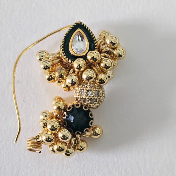 Elevate your traditional look with the Tulja Nath Green, a handcrafted golden nose ring featuring a delicate green motif. Available in both piercing and press-on styles, it is small to medium in size. This expertly crafted accessory combines classic design with versatility, offering an elegant touch to any ensemble.
